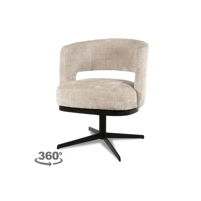 De 360° draaifunctie maakt hem extra praktisch in dagelijks gebruik en het zwarte metalen onderstel geeft een modern, stevig contrast. Alles klopt: uitstraling, comfort en gebruiksgemak.