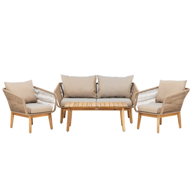 De bijgeleverde salontafel is volledig vervaardigd van massief acaciahout, met zijn kenmerkende warme houtkleur en natuurlijke nerf. De combinatie van het acaciahout in de tafel, de poten en de details van de sofaset creëert een samenhangend geheel dat zich onderscheidt van standaard aluminium loungesets.